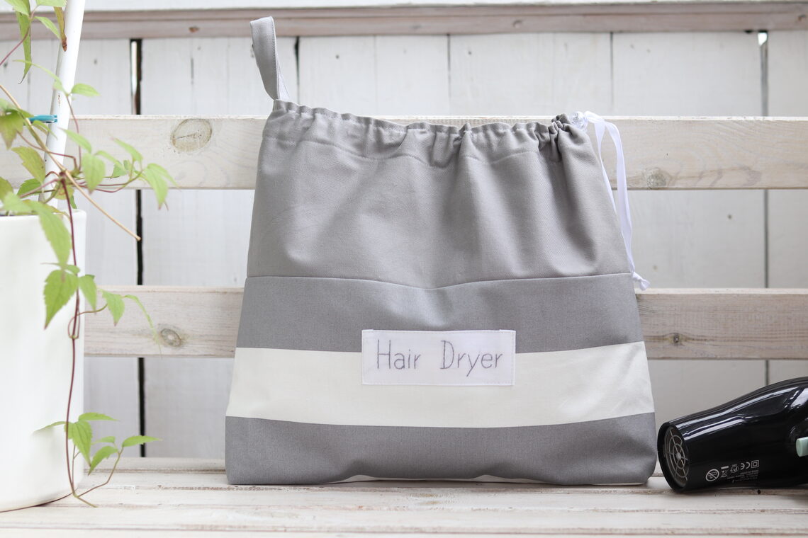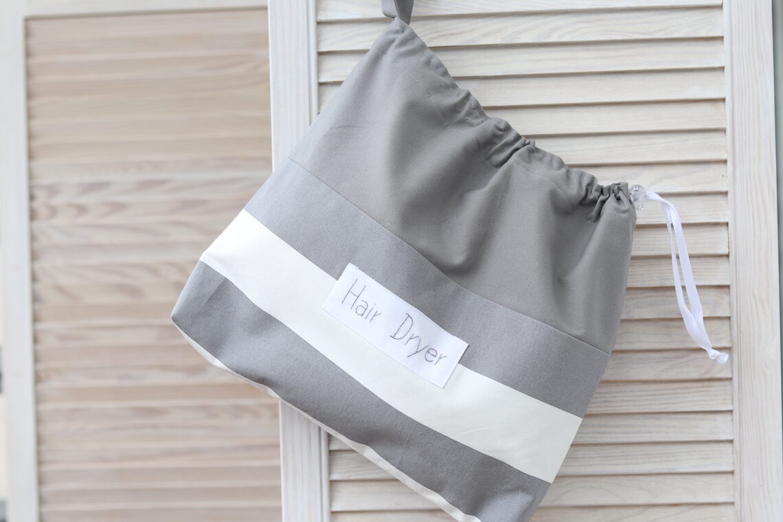 Personlig hårtørrertaske lavet af lysegrå, tyk bomuld og håndbroderet etiket (med dit navn osv.). Kan bruges som hårtørrertaske på rejser derhjemme. Lavet af tykt bomuldsstof, der beskytter hårtørreren.
