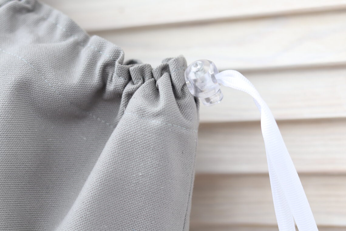 Detaljer: Lavet af tykt bomuldsstof, kasseformede hjørner i bunden (flad bund), flannelfor, stofkrog, grosgrainbånd, snorlås.