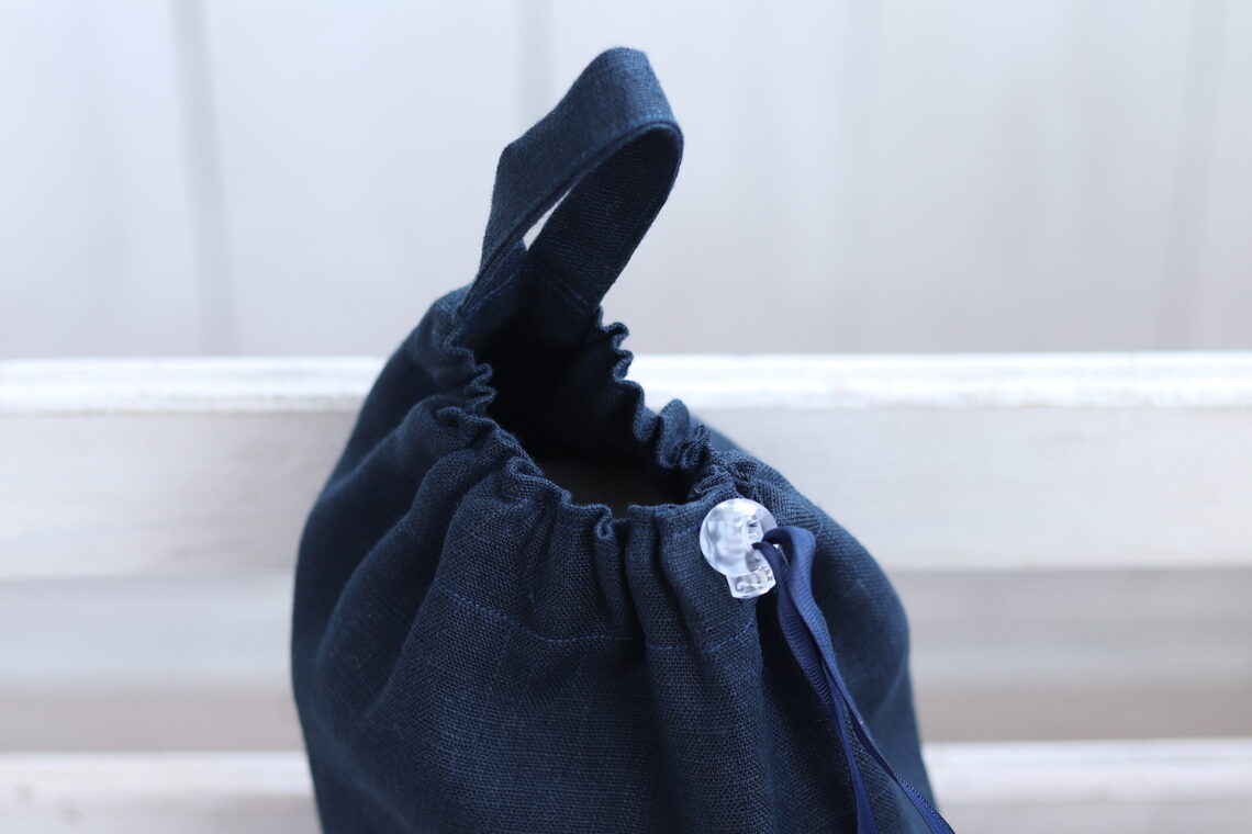 Details: Aus 100 % marineblauem Leinen, mit verstärkten Ecken (flacher Boden), Kordelzug, Stoffhaken und Kordelstopper.