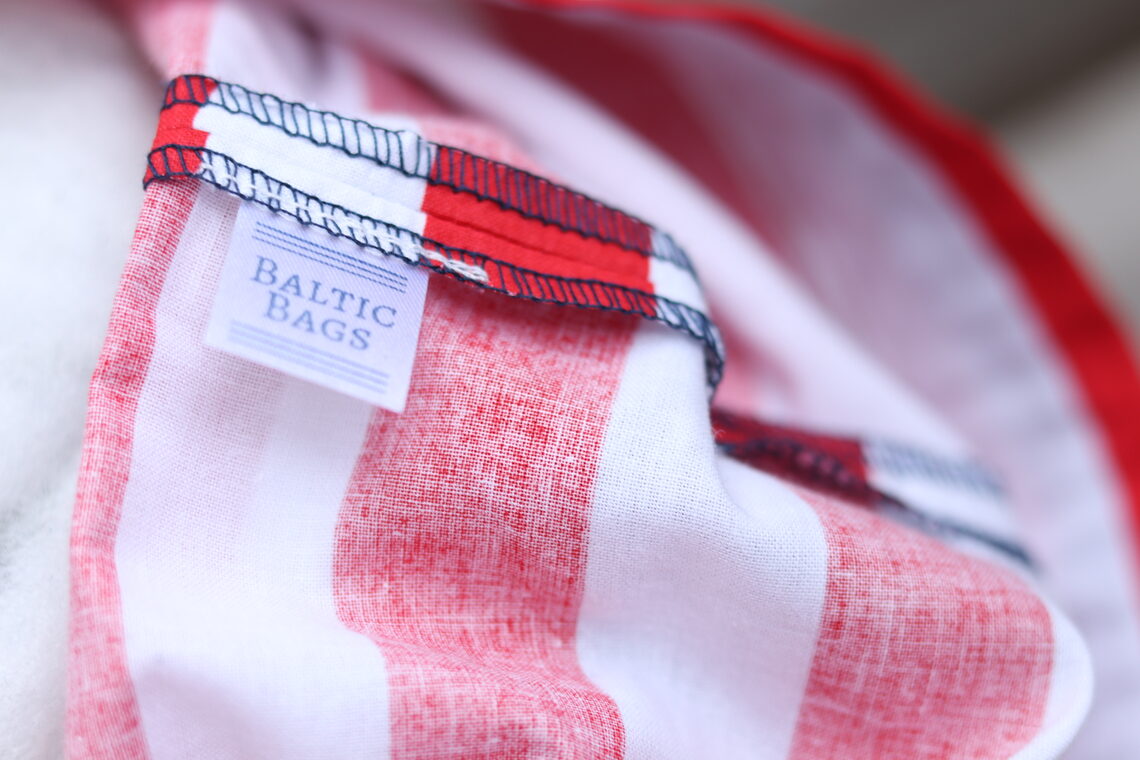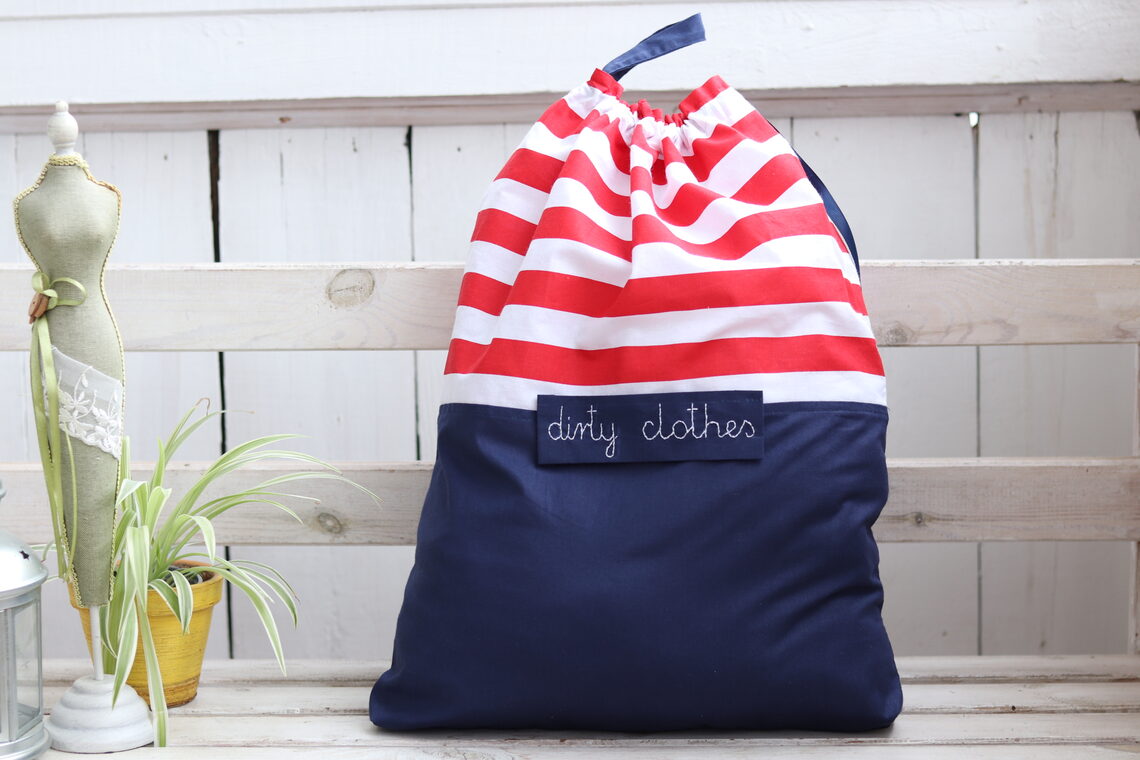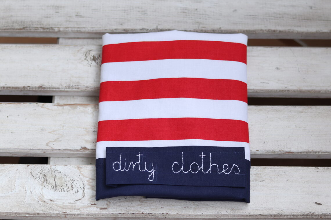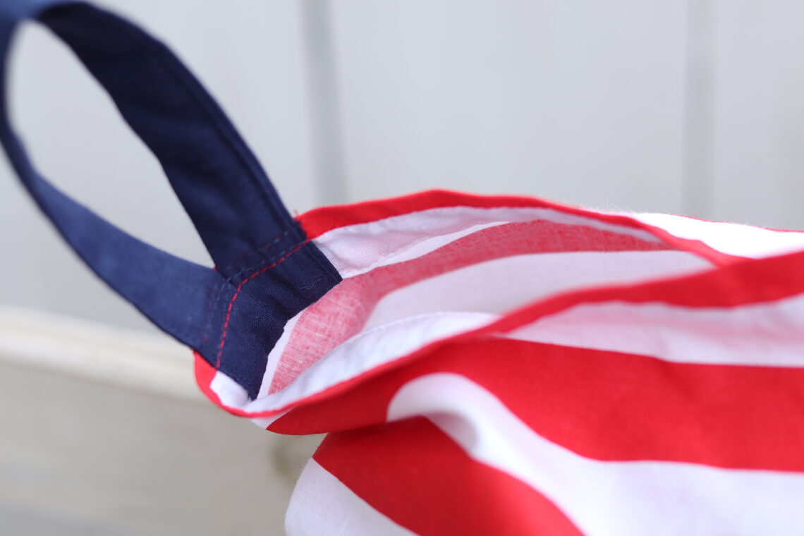 Detalles: Confeccionada en tela 100% algodón azul marino y tela de rayas blancas y rojas, esquinas inferiores reforzadas (base plana), cinta de grosgrain y gancho de tela.
