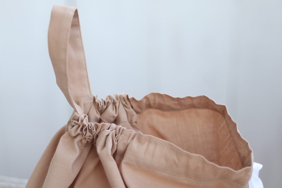 Dettagli: cotone beige e tessuto di cotone con righe bianche e beige di 0,5 cm, angoli inferiori arrotondati, coulisse.