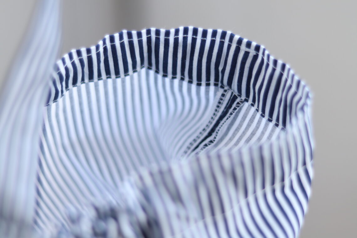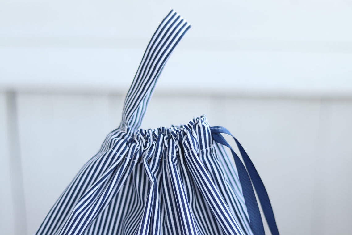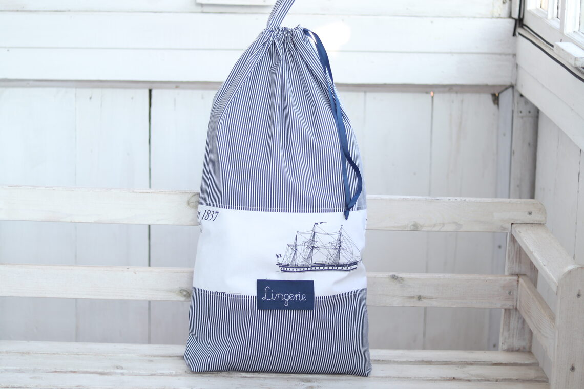 Detaļas: Izgatavota no kokvilnas svītraina auduma ar baltām un tumši zilām svītrām, rūtainiem apakšējiem stūriem (plakans dibens), grosgrain lentīti, auduma āķi.
