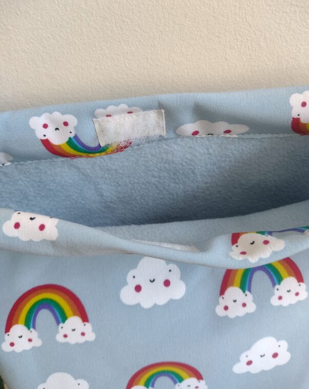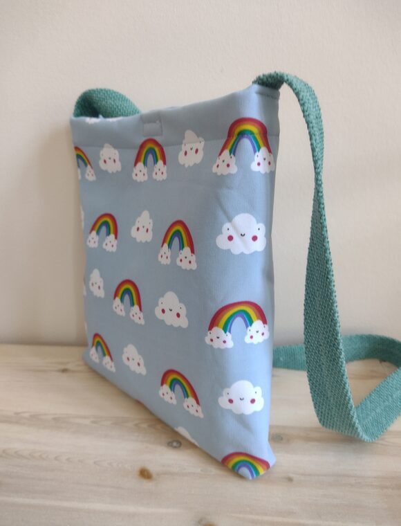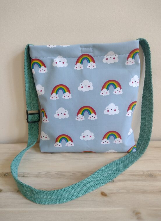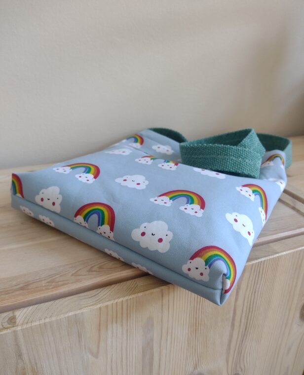 Varavīksnes apdrukas iepirkumu soma meitenēm, mīksta soma pār pleciem. Izgatavota no softshell materiāla – izturīga no ārpuses un mīksta no iekšpuses. Aizdare ar līplenti.