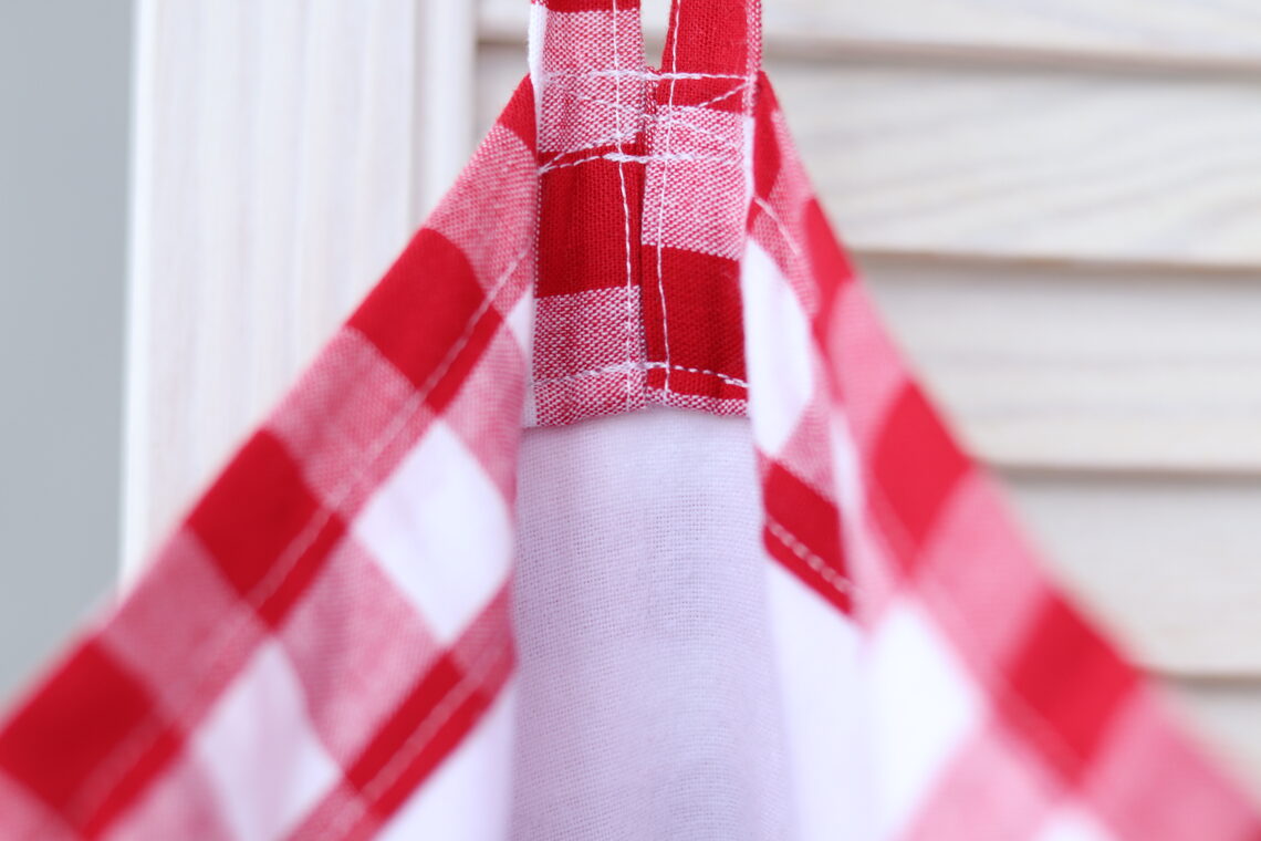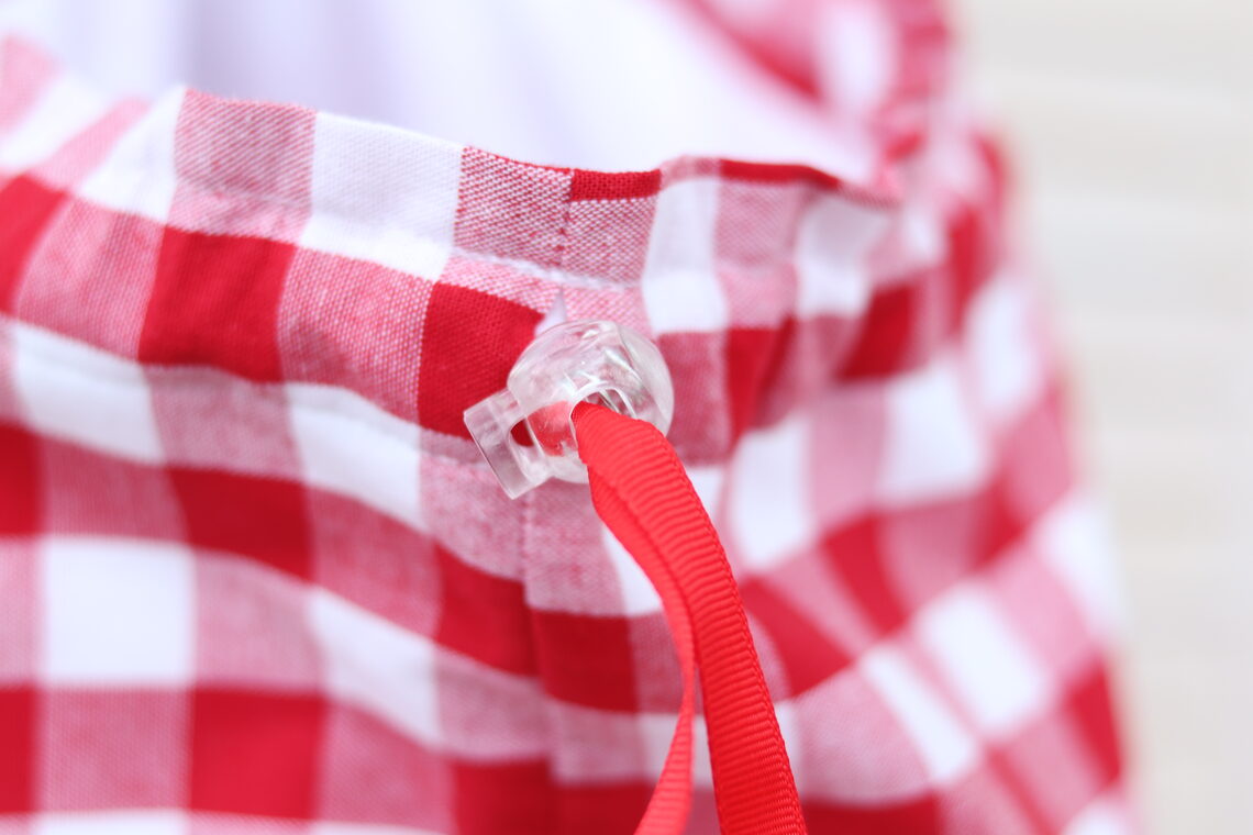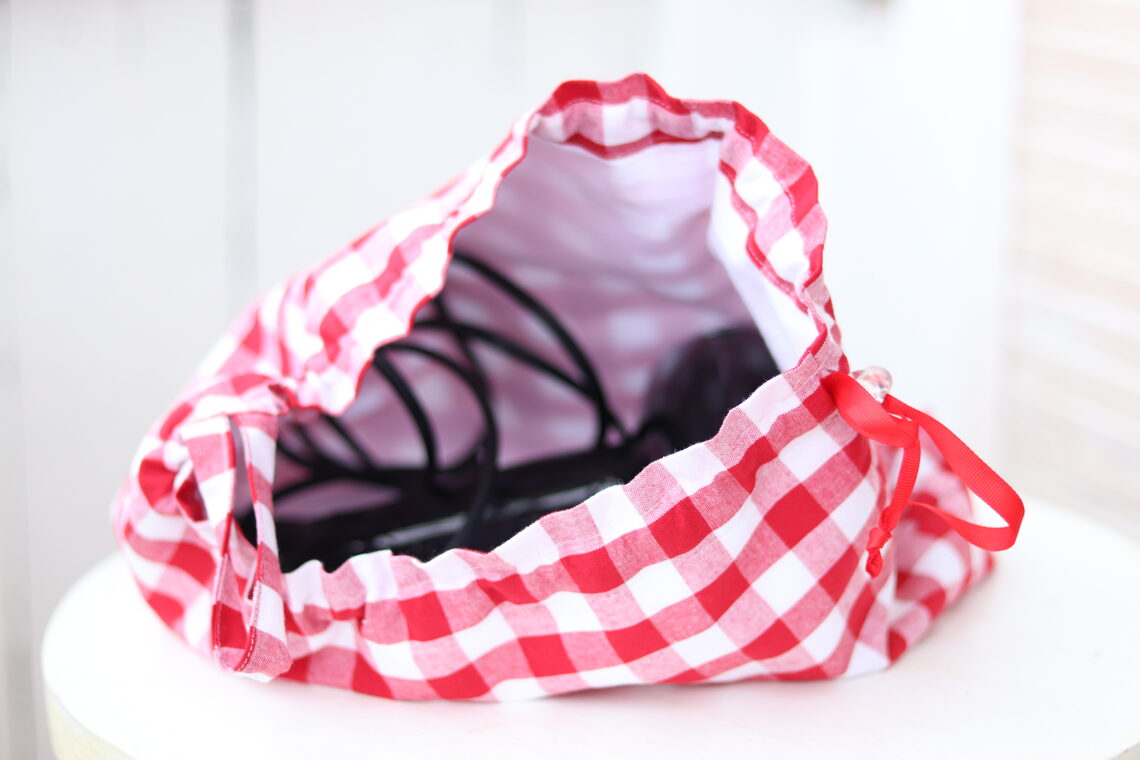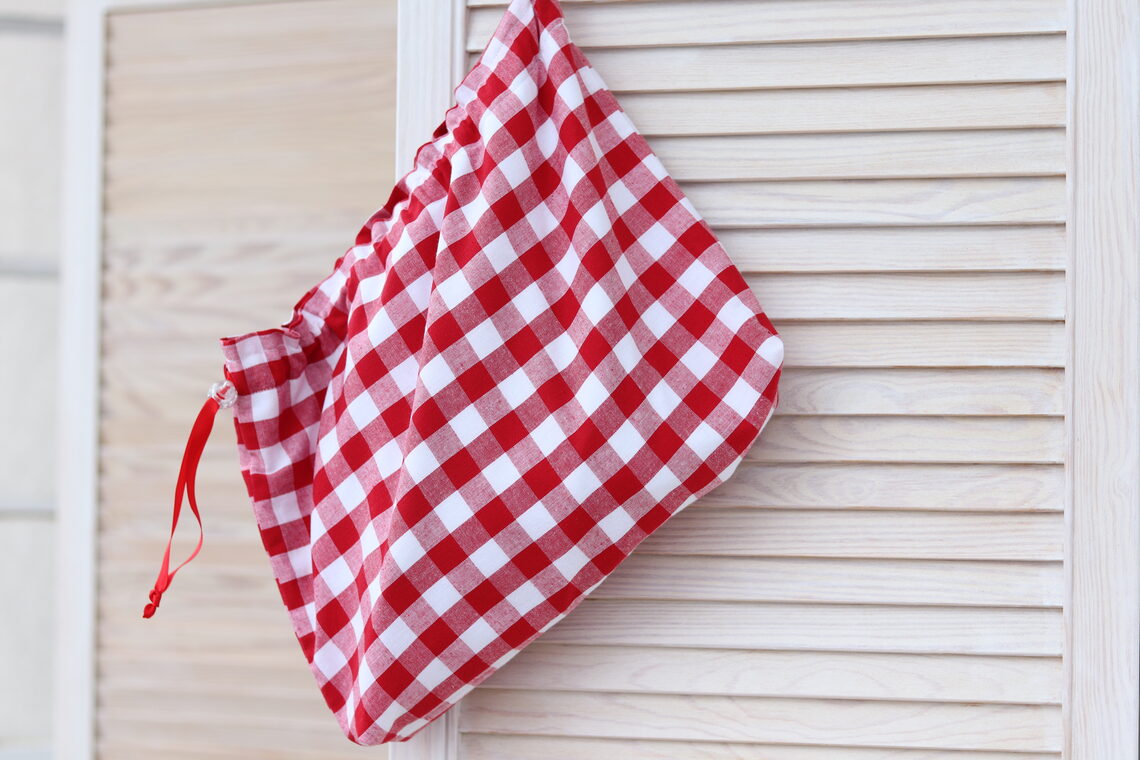 Details: Gemaakt van 100% rode katoenen geruite stof, ripsband, stoffen haak, witte flanellen voering, platte bodem, koordsluiting.