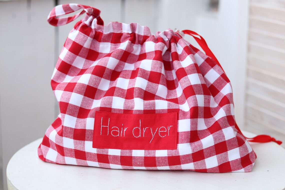 Gepersonaliseerde tas voor föhn met handgeborduurde inscriptie op etiket en flanellen voering. Kan worden gebruikt als föhntas tijdens het reizen of thuis.