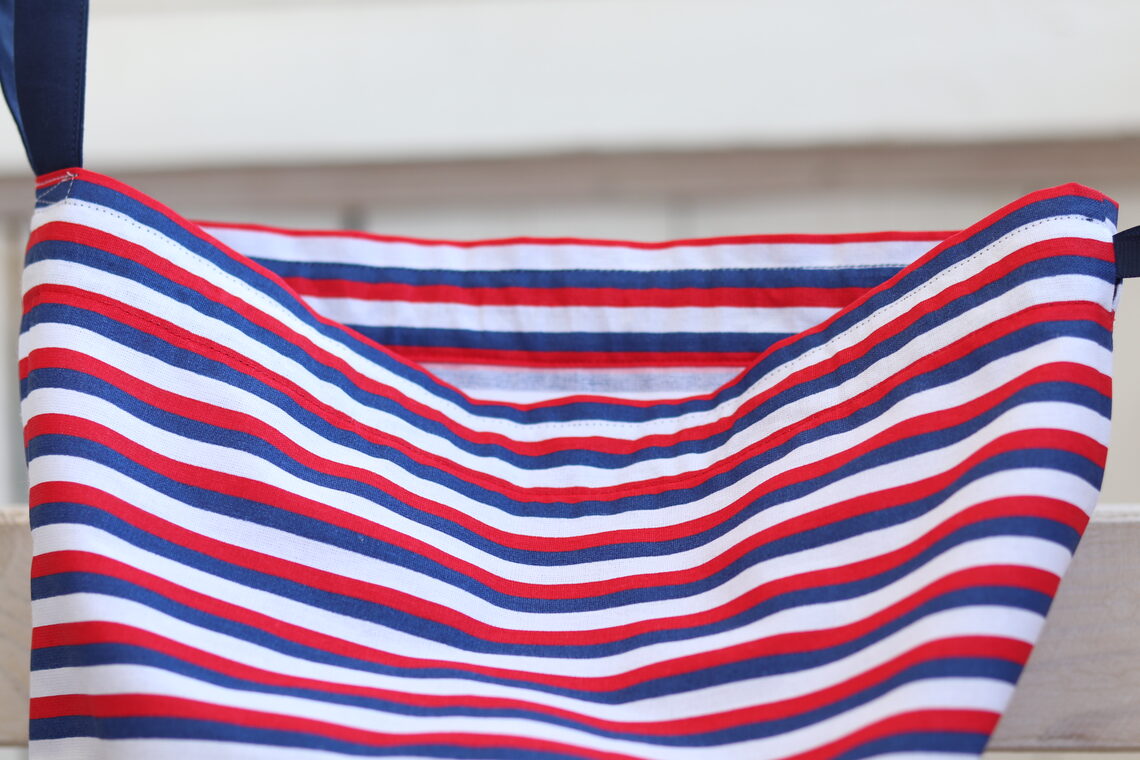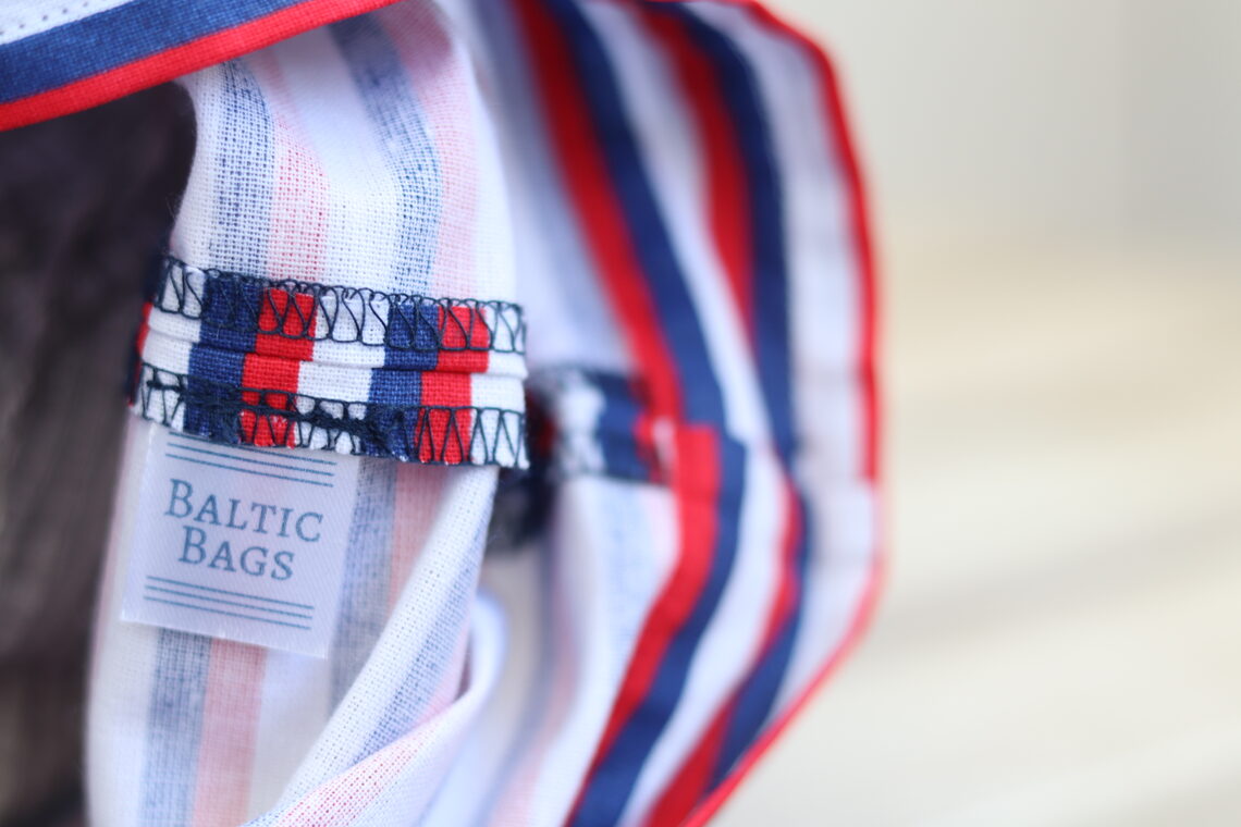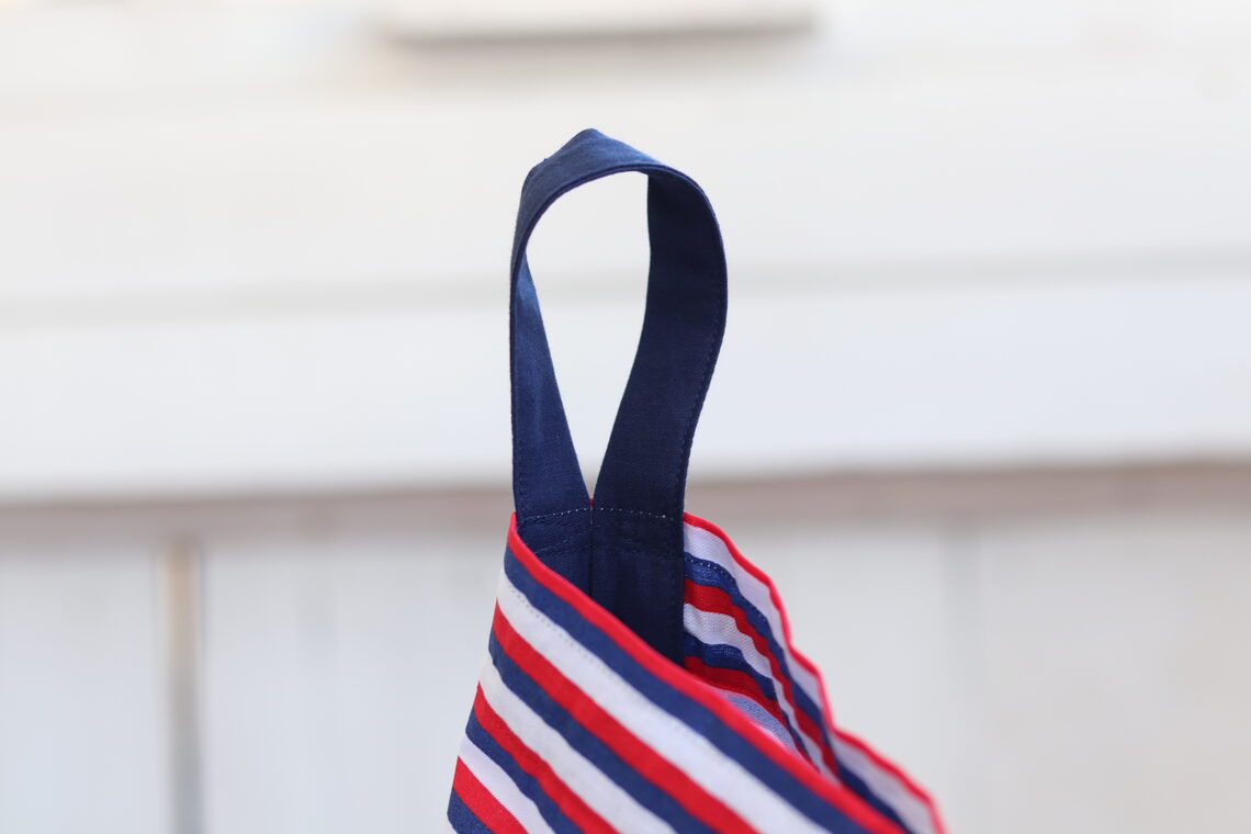 Details: Gemaakt van 100% katoenen strepenstof met 0,5 cm witte en rode, marineblauwe strepen, inscriptie op marineblauwe achtergrond, afgeronde hoeken onderaan (platte onderkant), ripslint.