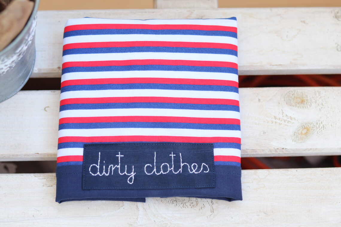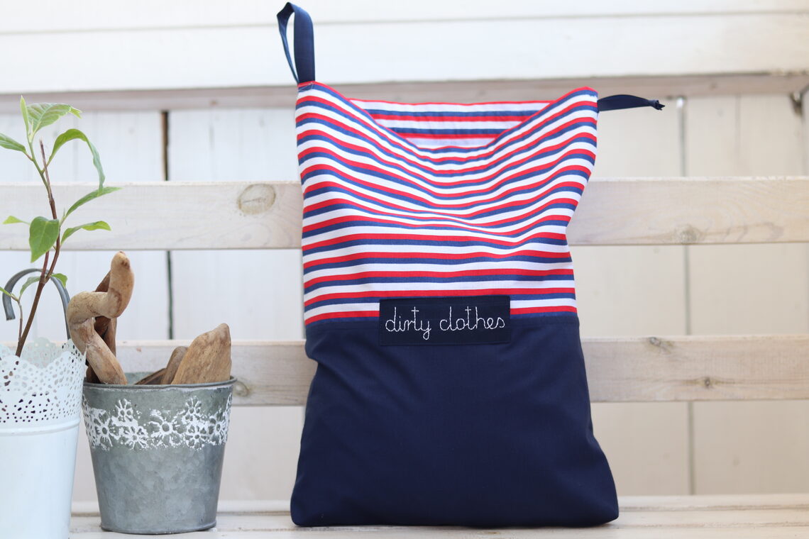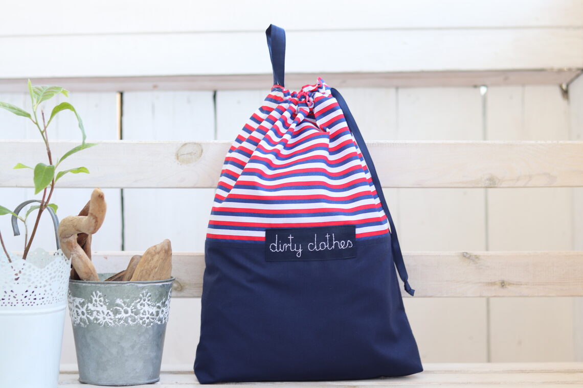 Een zakje gemaakt van rood, marineblauw en wit gestreepte stof met handgeborduurd label. Tas is handig tijdens het reizen of in de kledingkast als waszak of lingerietas.