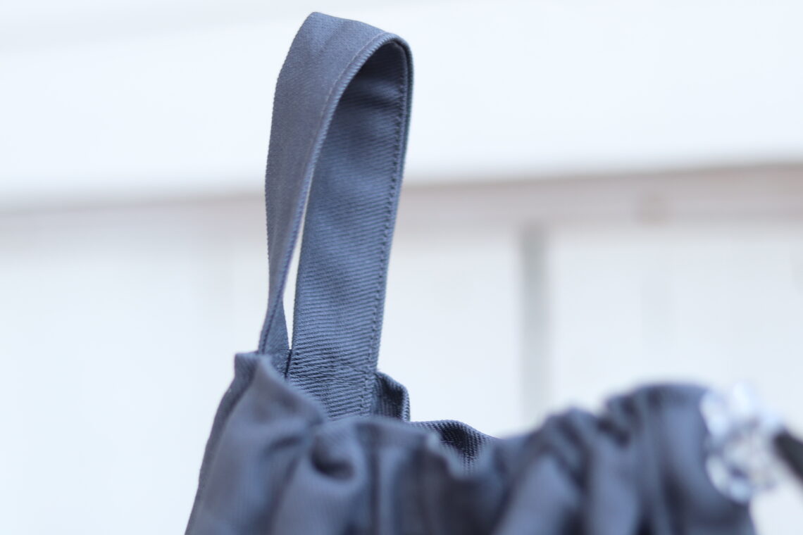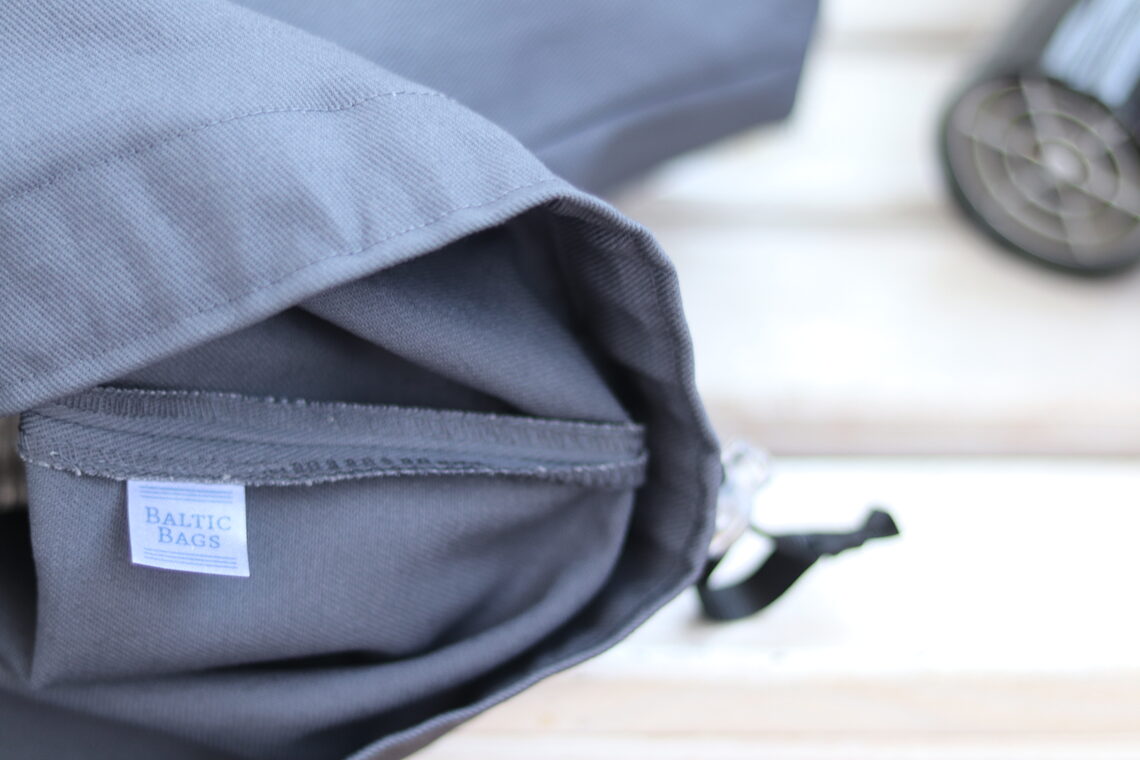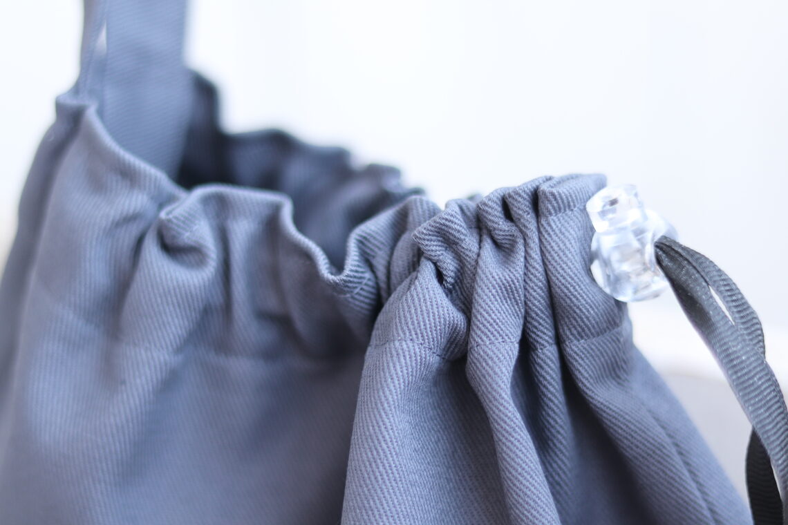 Details: Made of gray thick cotton, fabric weight: 280 g/m², boxed bottom corners (flat bottom), fabric hook, drawstring.
